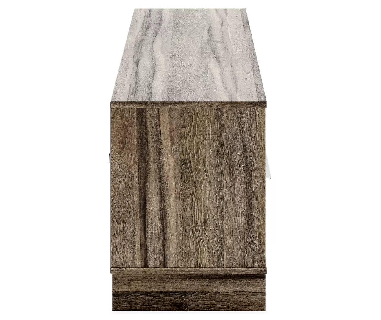 Your modern sanctuary is within reach. The subtle design of the Shallifer TV stand features two open cubbies for streamlined storage. Its weathered brown finish is accented with refined champagne-colored handles on the two smooth-gliding drawers.