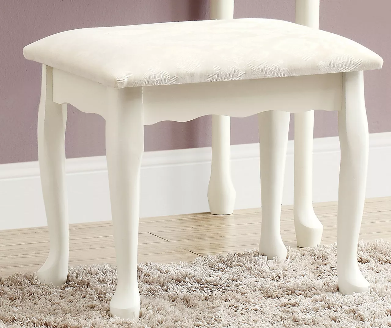 This elegant, two-piece vanity set will be the perfect addition to your traditional master bedroom or dressing area. This vanity set features a dainty apron and cabriole legs in an antique white finish, along with an oval swivel mirror and a storage drawer accented with a simple white wooden knob for keeping brushes and accessories organized. The stool matches with the same elegant cabriole legs with a tone on tone white floral fabric covered seat for a regal look and feel that will add sophistication to any room.