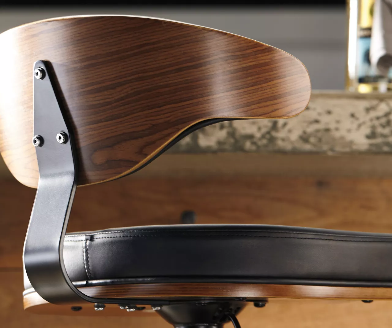 Entertaining style takes quite a mid-century modern turn with this Bellatier barstool. Sporting a distinctively contoured back, this upholstered swivel barstool is sure to bring a high-end designer look to your living space. Wrapped in a black faux leather upholstery, it gives a great vintage vibe for your next party in comfort and style.