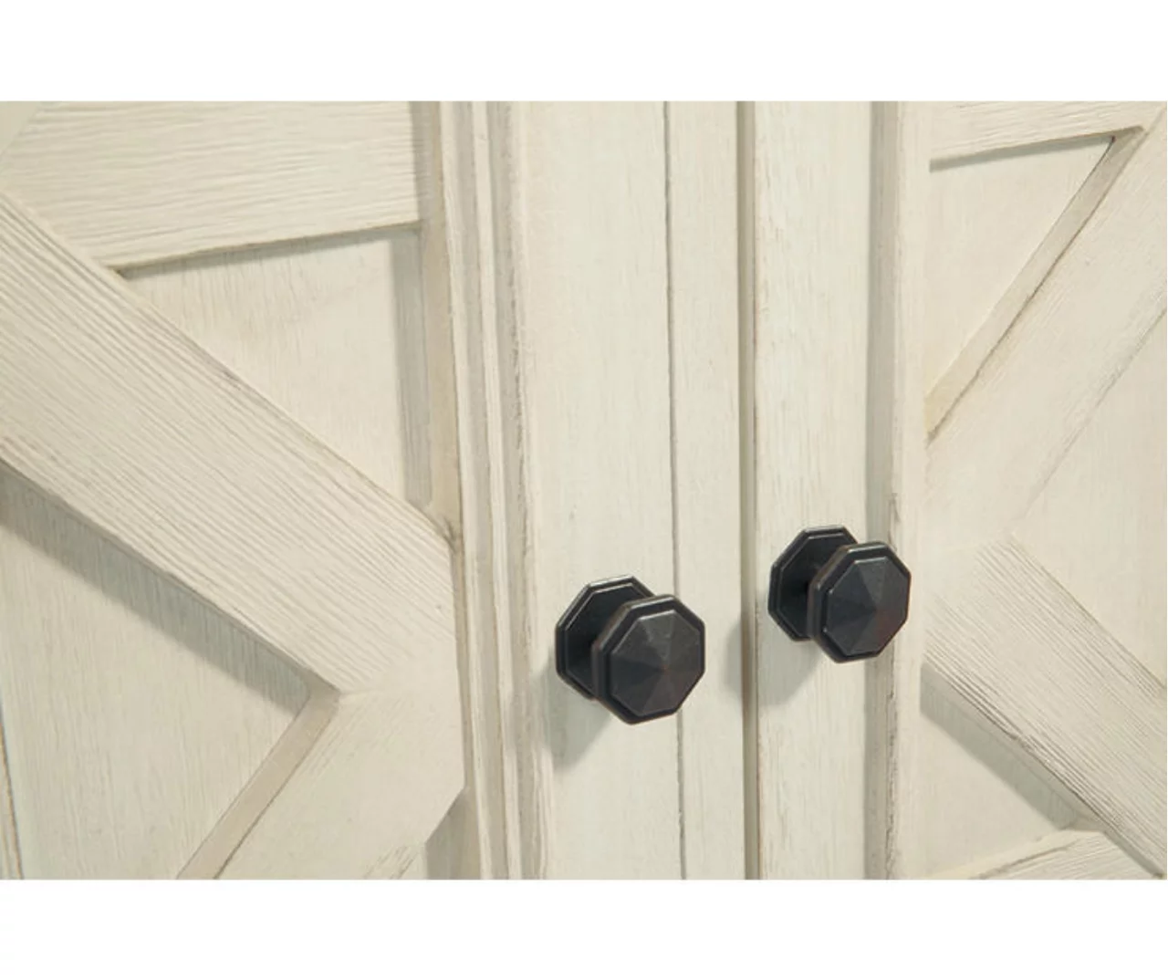 Need a stylish space to store dinnerware and all your dining room essentials? This server is a dream come true with two adjustable shelves that offer large capacity and a spacious top that’s perfect for setting a buffet. Embellished with the casual appeal of three latticed doors, an attractive planked top with a weathered oak finish and a lightly distressed white finish throughout, this vintage look will serve up elegance for years to come.
