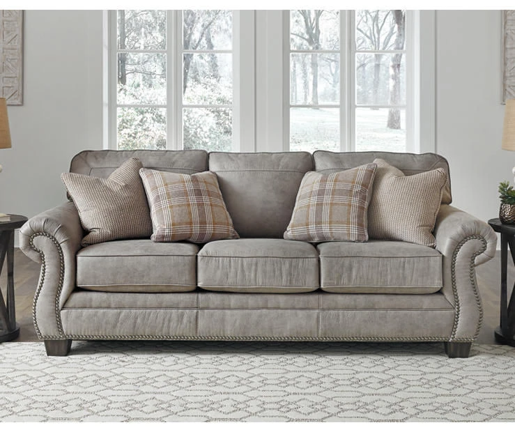 Seamlessly merging classic elements with modern trends, the Olsberg sofa invites you to bring home the best of then and now. Wrapped in a fabulous steel gray upholstery with sumptuous suede-like feel, this easy-elegant sofa is dressed to impress with updated roll arm styling and tailored touches including nailhead trim and window pane stitching. What you can’t see is every bit as impressive. Reversible seat cushions crafted with our highest quality coils provide a bit of bounce and plenty of comfort and support.